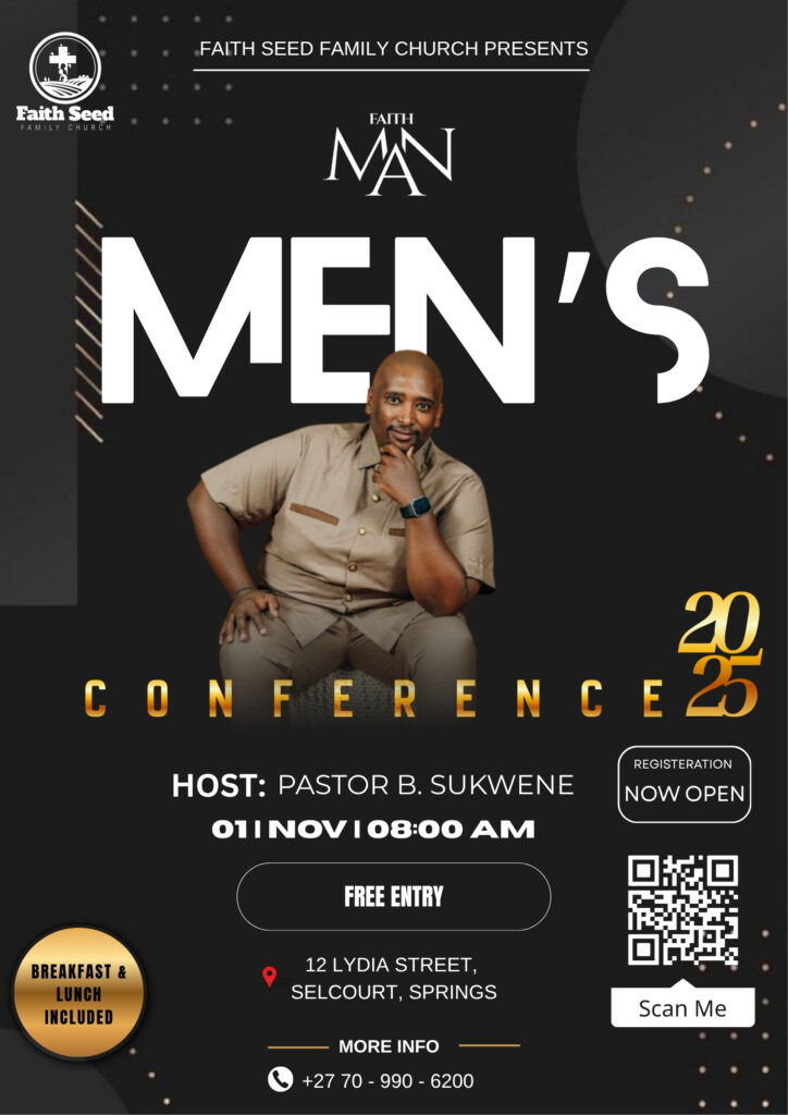 Join us for the first-ever Annual Men’s Conference on Saturday, 1st November 2025, hosted by Pastor Bafana Sukwene a powerful gathering designed to awaken purpose, ignite identity, and equip men to walk boldly in what God has ordained for them.